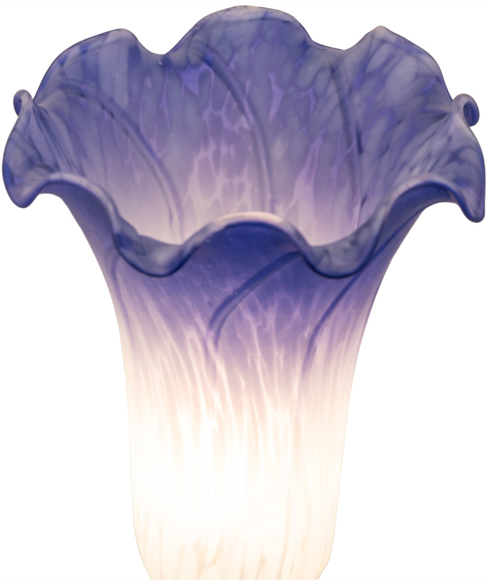 The 13" High Blue/White Pond Lily Twin Cherub Mini Lamp is a timeless piece inspired by the famous Tiffany design from the early 1900s. This mini lamp boasts a stunning shade that is mouth-blown from fine blue and white art glass, creating an enchanting gradient effect. The delicate lily shape of the shade adds a touch of elegance and sophistication, making it a perfect addition to any room with a classic or vintage theme.