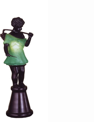 Charming; lighted sculpture of blown art glass and cast iron head; arms; legs and base; in rich Mahogany Bronze Finish.
