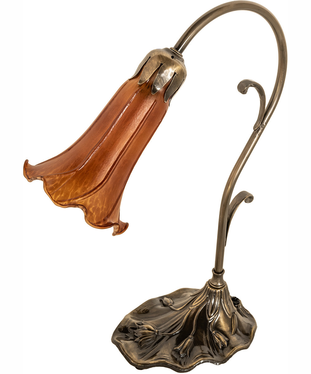 Inspired by the famous Tiffany design from the early 1900s. This mini lamp features a stunning shade mouth blown of fine Amber art glass. The Lily shade is embraced by an elegant cast metal base finished by hand in Antique Brass. The Pond Lily Mini Lamp is featured in our American designed; handcrafted Favrile Glass Lighting Collection. UL and cUL listed for dry locations. Each shade is a unique work of art with color variations based on natural ingredients inherent in the glass. Contact us if color matching is critical when ordering multiple items.