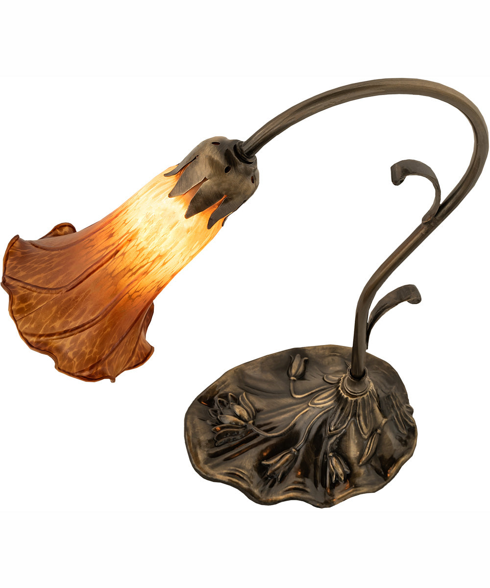 Inspired by the iconic Tiffany designs of the early 1900s, the 15" High Amber Tiffany Pond Lily Accent Lamp is a stunning addition to any home. This exquisite lamp features a beautifully crafted shade made from fine Amber art glass, mouth-blown to perfection. The lily-shaped shade is gracefully embraced by an elegant cast metal base, meticulously finished by hand in Antique Brass. This timeless piece is part of our American-designed, handcrafted Favrile Glass Lighting Collection, ensuring each lamp is a unique work of art.