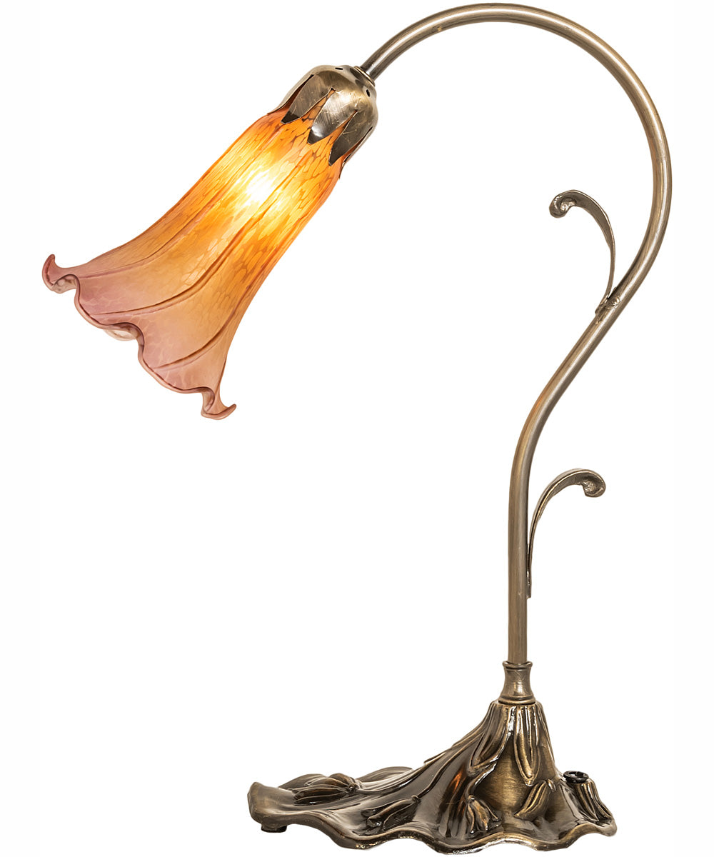 Inspired by the timeless Tiffany design from the early 1900s, the 15" High Amber/Purple Tiffany Pond Lily Accent Lamp is a stunning addition to any room. This mini lamp features a delicate lily-shaped shade, mouth-blown from fine amber and purple art glass. The intricate design of the shade is complemented by an elegant cast base, finished by hand in antique brass. The graceful curves and detailed craftsmanship make this lamp a true work of art.