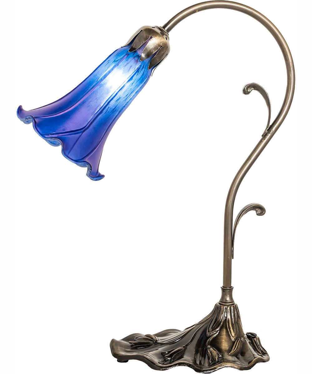 The 15" High Blue Tiffany Pond Lily Accent Lamp is a stunning piece inspired by the iconic Tiffany designs from the early 1900s. This exquisite lamp features a captivating blue art glass shade that gracefully mimics the delicate form of a pond lily, creating a harmonious blend of nature and artistry. The shade is embraced by an elegant cast base, meticulously finished by hand in antique brass, adding a touch of vintage charm to any space.