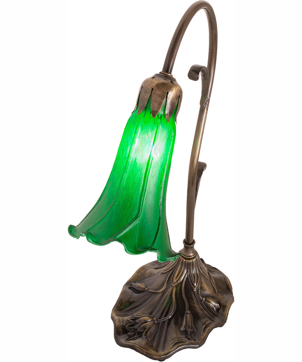The 15" High Green Tiffany Pond Lily Accent Lamp is a stunning piece inspired by the famous Tiffany design from the early 1900s. This exquisite lamp features a beautiful shade, mouth-blown from fine green glass, which mimics the delicate petals of a pond lily. The elegant gooseneck base, finished by hand in antique brass, adds a touch of sophistication and timeless charm to any room.