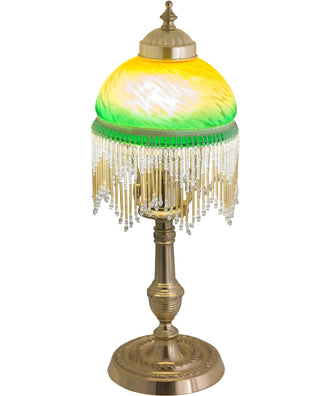 A charming nostalgic accent lamp. This Roussillon Lamp features a stunning Amber and Green Mottled Glass shade that is color coordinated with delicate Gold and Clear glass beaded fringe. This Victorian-inspired; intricately detailed shade is combined with a beautifully detailed lamp base in a Brass plated finish.