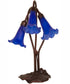 The 16" High Blue Tiffany Pond Lily 3 Light Accent Lamp is a stunning piece that embodies the timeless elegance of Louis Comfort Tiffany's iconic designs. This lamp features three delicately crafted lily-shaped shades, each mouth-blown from fine art glass in a softly mottled indigo blue hue. The shades are suspended gracefully from stems that wind above a beautifully detailed lily pad base, finished in a rich mahogany bronze. This intricate design adds a touch of sophistication and charm to any space.