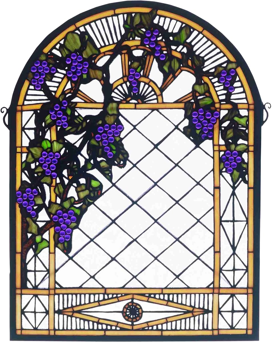 Radiant Concord Purple jewels; Vineyard Green leaves and glistening dew kissed Bark Brown vines wrap around a Golden Sunshine bands on a diamond grid of Clear seeded glass. Bring sunny vineyards to your own home with this lovely Meyda Tiffany original stained glass window. A solid brass hanging bracket and chains are included