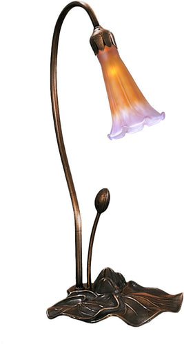 One of the most popular Louis Comfort Tiffany styled lamps on the market today; recreating his famous Favrile design from the early 1900's. This mottled Amethyst tipped Amber shaded One Light Accent Lamp offers an attractive; delicate design featuring shades mouth blown of fine art glass. Lily shades are suspended from stems delicately winding above a Lily pad base finished by hand in Mahogany Bronze.