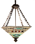 Patterns and colors of Native American blankets and pottery have given inspiration to this Meyda Tiffany designed Mission style stained glass shade. The intricately patterned shade of Bark Brown granite glass with Sand Beige and Turquoise is combined with clean lined Mission style inverted pendant hardware that has an earth toned Mahogany Bronze hand applied finish.