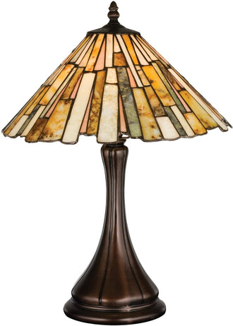 The 17"H DeLighta Jadestone Accent Lamp is a stunning piece that combines timeless elegance with modern craftsmanship. The lamp features a meticulously crafted shade made from thinly carved and polished natural jadestone. The earthy tones of moss green, tan, ivory, and coral create a mesmerizing mosaic that becomes luminescent when illuminated. This unique tile-patterned shade is crafted using the same copperfoil process as traditional stained glass Tiffany-style shades, adding a touch of classic sophistication to any room.