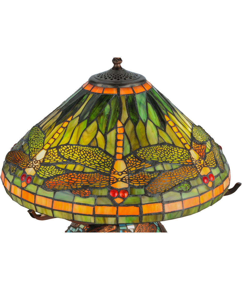 Introducing the 17"H Tiffany Dragonfly w/Tiffany Mosaic Base Table Lamp, a masterpiece inspired by the iconic designs of Tiffany Studios. This stunning lamp features diving dragonflies with glowing scarlet jeweled eyes and delicate metal filigree wings, gracefully encircling the shade. The hand-cut and copper-foiled pieces of Pond Green art glass create a mesmerizing backdrop, while Sunset Red bands add a vibrant touch to the top and bottom of the shade. The intricate dragonfly design continues on the base, which boasts a Pond Green glass mosaic inlay and a hand-finished Mahogany Bronze finish.