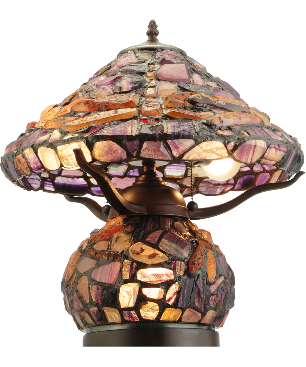 The 19"H Dragonfly Agata Table Lamp is a stunning recreation of Tiffany Studio's most beloved designs. This exquisite lamp features a mesmerizing shade adorned with intricate dragonfly motifs, each crafted with glowing red jeweled eyes and delicate sunset agate wings. The captivating design is further enhanced by the use of natural agate stones in shades of purple, violet, golden, and silver, creating a vibrant and enchanting display. The lamp’s base, made from metal or polyresin, complements the shade perfectly, featuring a matching agate stone design that adds to its overall charm.