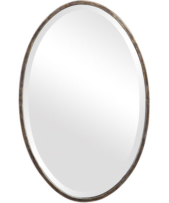 This narrow oval frame is made of metal and finished in a rich dark bronze with golden highlights. The mirror has a generous 1.25" bevel. May be hung either vertically or horizontally.