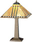 With their love of geometric forms; architects of the Prairie School interpret organic objects into simplified lines. The Meyda Tiffany Prairie Corn table lamp shade has rows of Chili Red and Wheat kernels and stalks of Bronzed Jade against a Maize Gold background. The stained glass shade is paired with a simple Mission style table lamp in a Mahogany Bronze finish.