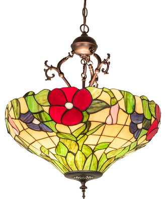 The 20" Wide Peony Inverted Pendant is a stunning piece that brings the timeless beauty of peony flowers into your home. Inspired by classic Tiffany-style shades, this pendant light features full blooms of Cinnabar Red and Pink Peonies nestled in a halo of Spring Green leaves. The intricate design is reminiscent of beautiful flower gardens, from Portland, Maine to Ann Arbor, Michigan, and Aimes, Iowa. The art glass shade, created using the famous Meyda Tiffany copperfoil construction technique, is complemented with elegant cast metal hardware finished in a warm Mahogany Bronze. This combination of vibrant colors and high-quality materials makes it a true work of art.