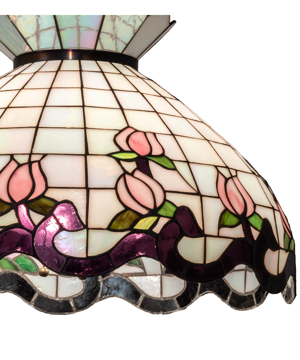 Enhance the ambiance of your home or commercial space with the exquisite 20" Wide Roseborder Pendant. This stunning ceiling fixture features a beautifully crowned shade that highlights a gridwork of White art glass. The elegant design is adorned with a Plum-colored border of swirling ribbons and delicate Pink Rosebuds, complemented by Green leaf accents. The intricate details and vibrant colors make this pendant light a true work of art, perfect for adding a touch of sophistication to any room.