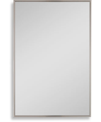 Appearing as if the mirror is floating, this simple and clean design is perfect over a bathroom vanity. Finished in a warm silver, the frame will complement many different fixtures. May be hung either vertically or horizontally.