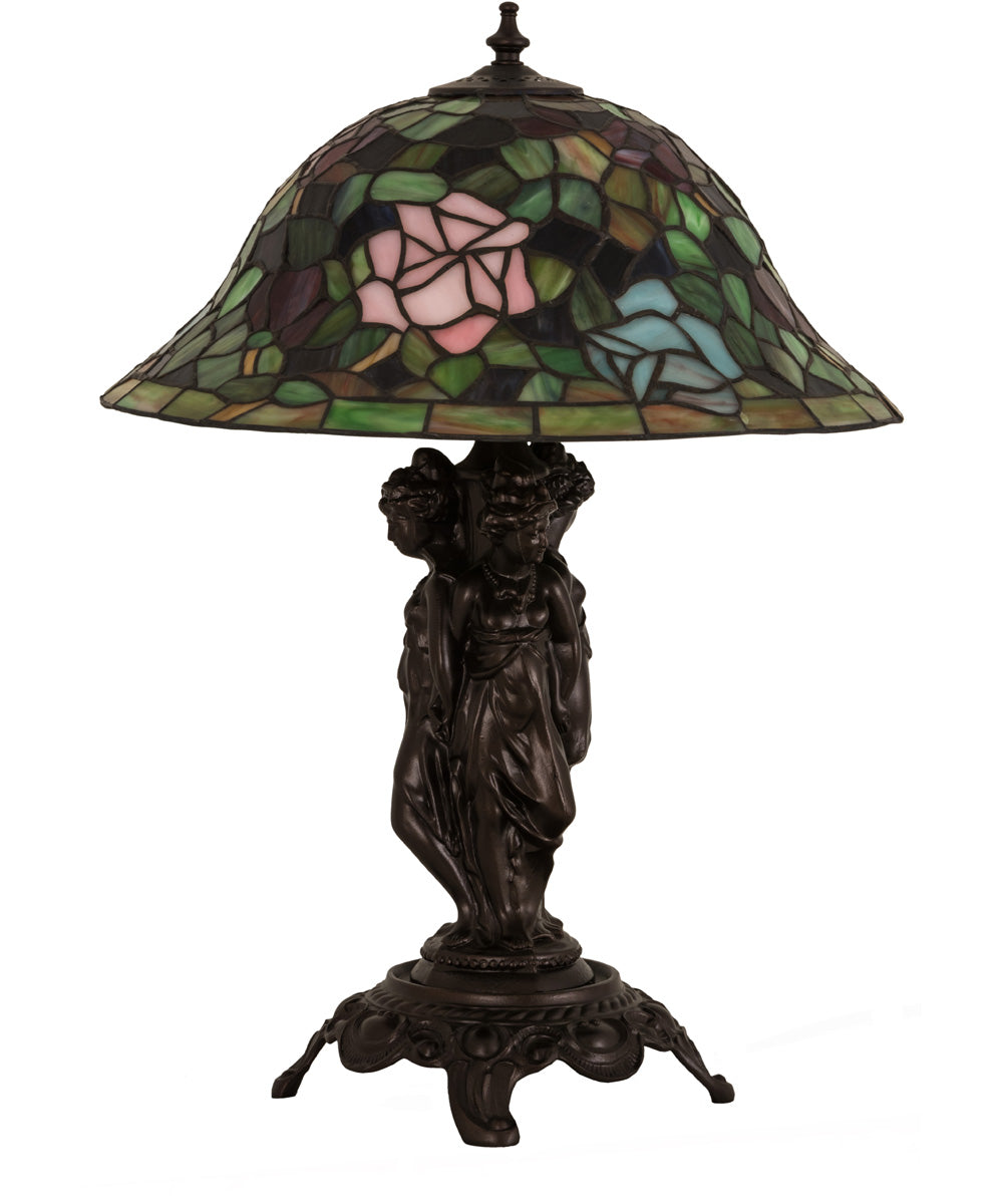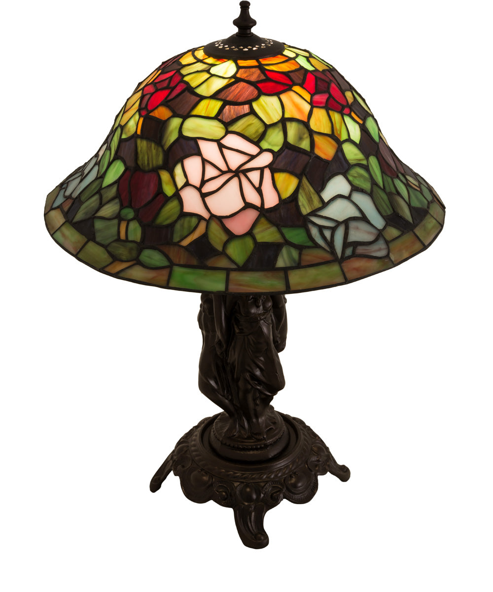 Recap: The 22"H Rosebush Table Lamp features a handcrafted stained glass shade with a vibrant rosebush pattern, a mahogany bronze finished base, and is UL listed for damp locations. Perfect for various rooms and interior styles, it provides both functional lighting and a beautiful decorative element. Order yours today to enhance your home's decor.