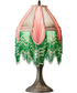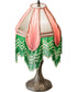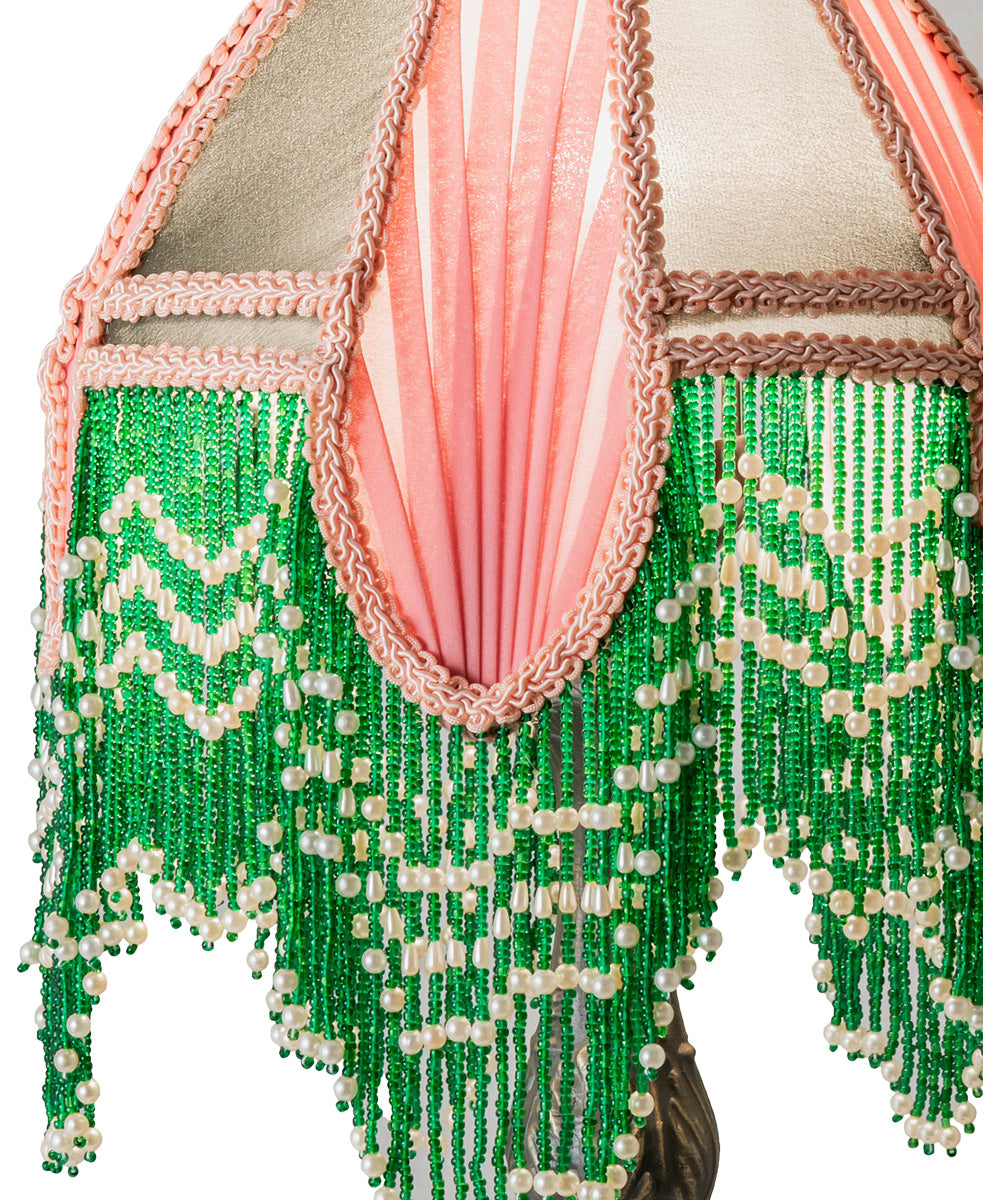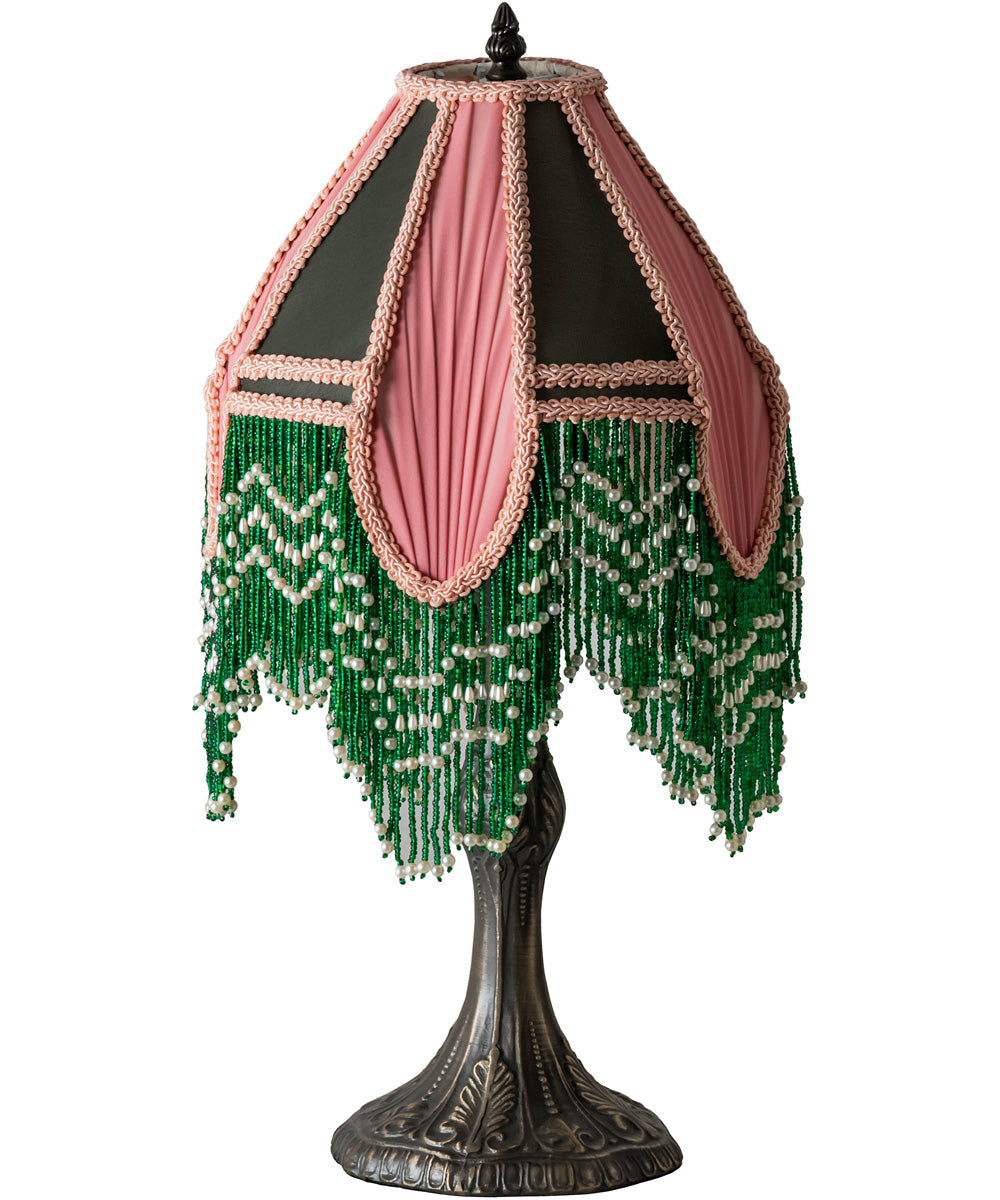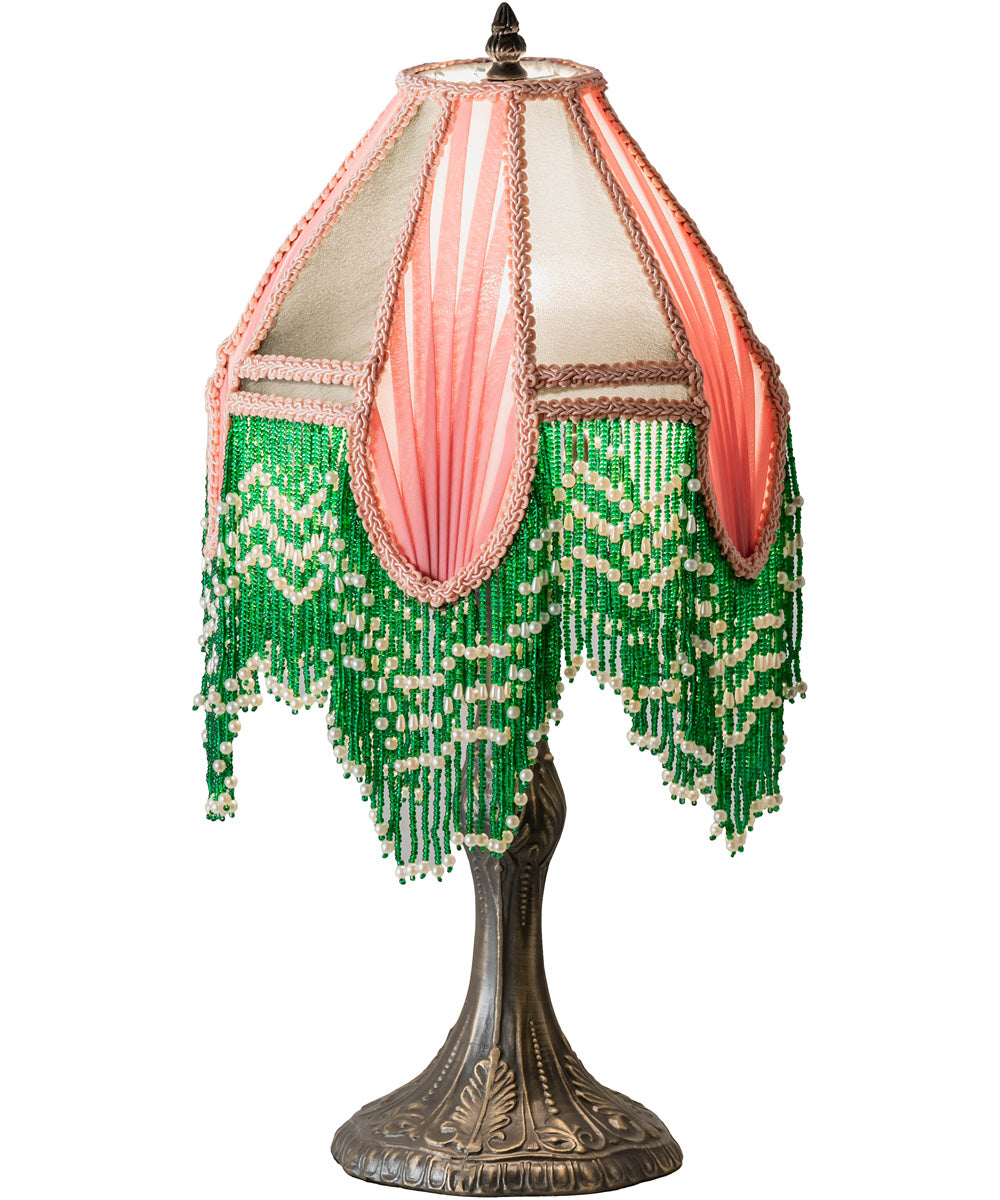 This Victorian inspired table lamp adds a touch of elegance to your darkest night. An exquisite Gray Fabric design is accented with soft Pink Pleated Panels. This handmade fabric shade is enhanced with Kelly Green and White beaded glass fringe trim which is knotted across a gracefully curving form. This beautifully detailed lamp base is finished in Mahogany Bronze. UL and cUL listed for dry locations.