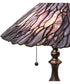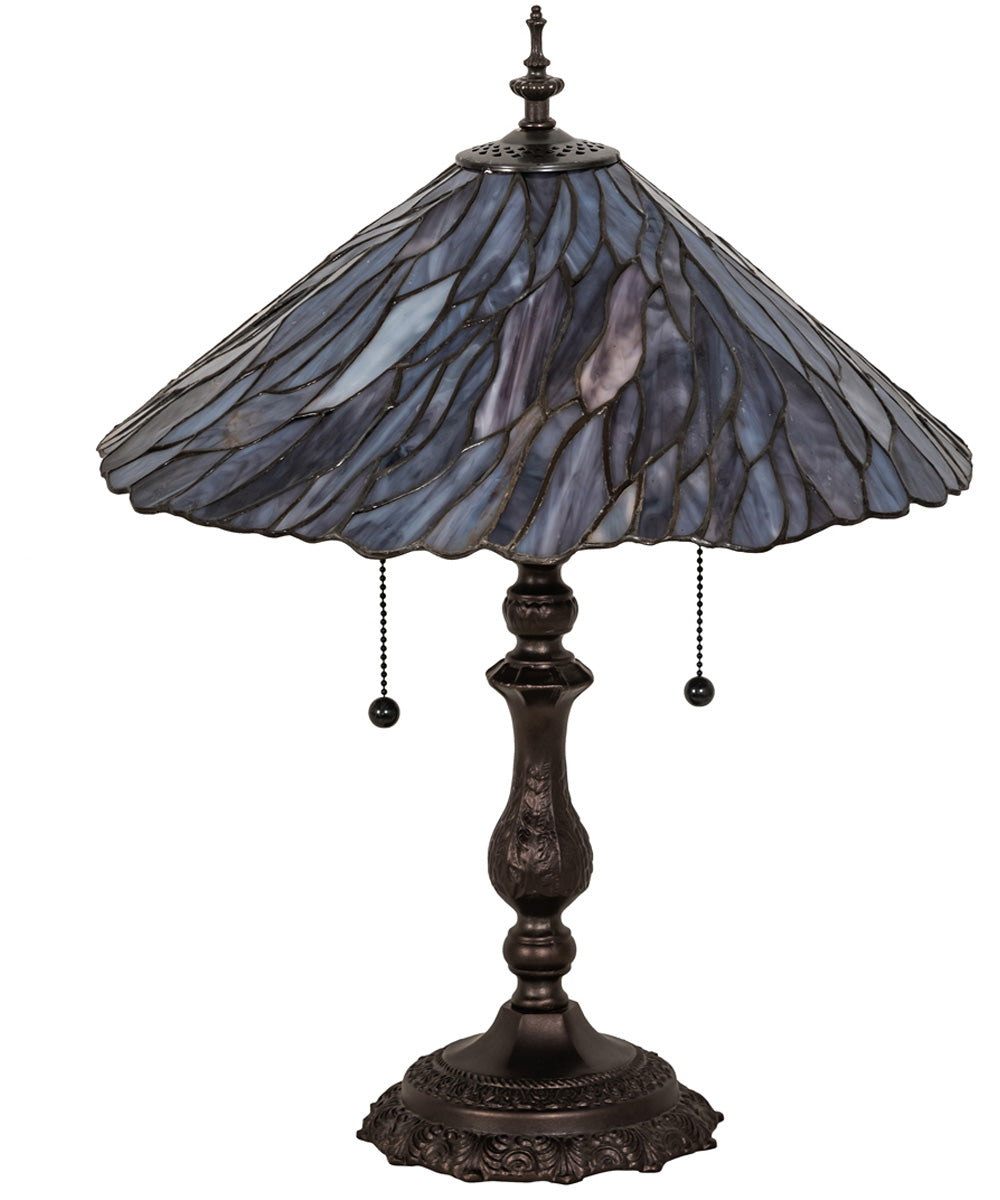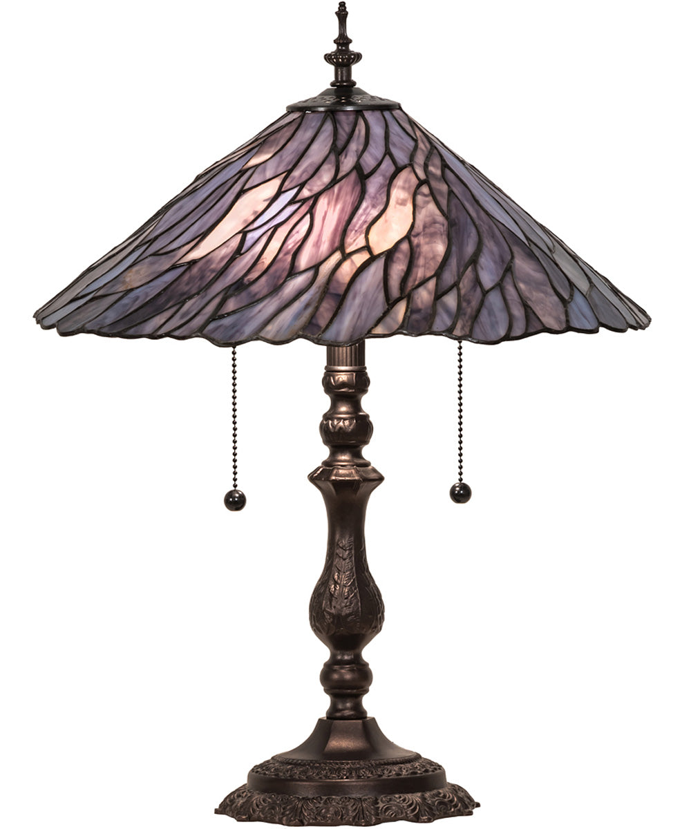 Intricately hand-cut pieces of art glass in stunning hues of Purple; Blue and Mauve becomes luminescent in this wispy willow leaf patterned shade. The Willow shade is created using the famous Meyda copperfoil construction process. The shade is complemented with a sculpted lamp base in a warm Mahogany Bronze finish. The lamp is UL and cUL listed for dry locations.