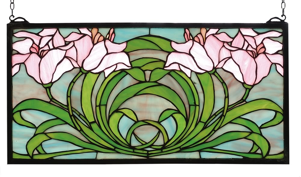 Soft Petal Pink lilies atop Spring Green leaves form a circle on a sky of Dusky Blues in this nature inspired stained glass window. The rectangular Meyda Tiffany original window is framed in solid brass and has brass mounting bracket and chains included.