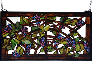 Radiant Concord Purple jewels with Vineyard Green leaves and glistening dew kissed Bark Brown vines on a Golden arbor accent a Crystalline glass background. 490 pieces of hand cut stained glass; bring sunny vineyards into home with this lovely hand crafted Meyda Tiffany original window. A solid brass hanging bracket and chains are included.