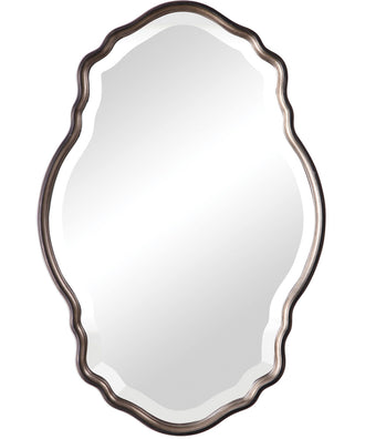 Graceful curves add elegance to this unique mirror. The frame features an antique silver champagne finish, accented with a dark bronze outer edge. The mirror has a 1.25" bevel. May be hung either vertically or horizontally. Also available in gold, W00525.