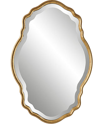 Graceful curves add elegance to this unique mirror. The frame features a rich gold finish with amber glaze. The mirror has a 1.25" bevel. May be hung either vertically or horizontally