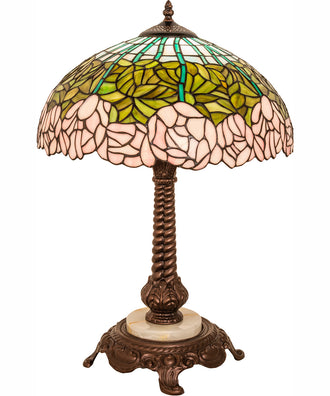 The Tiffany Cabbage Rose Table Lamp is not only a beautiful decorative piece but also a functional lighting solution. It features a zinc/onyx base material with pink, green, and blue brass/glass accents. The lamp accommodates one 60-watt E26 base bulb, providing ample light for reading, working, or simply creating a cozy ambiance. Additionally, it is UL and cUL listed for dry locations, ensuring safety and reliability.