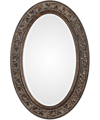 This oval frame features an embossed flowing leaf design, finished in an aged bronze with antique gold undertones. The mirror has a 1" bevel. May be hung either vertically or horizontally.