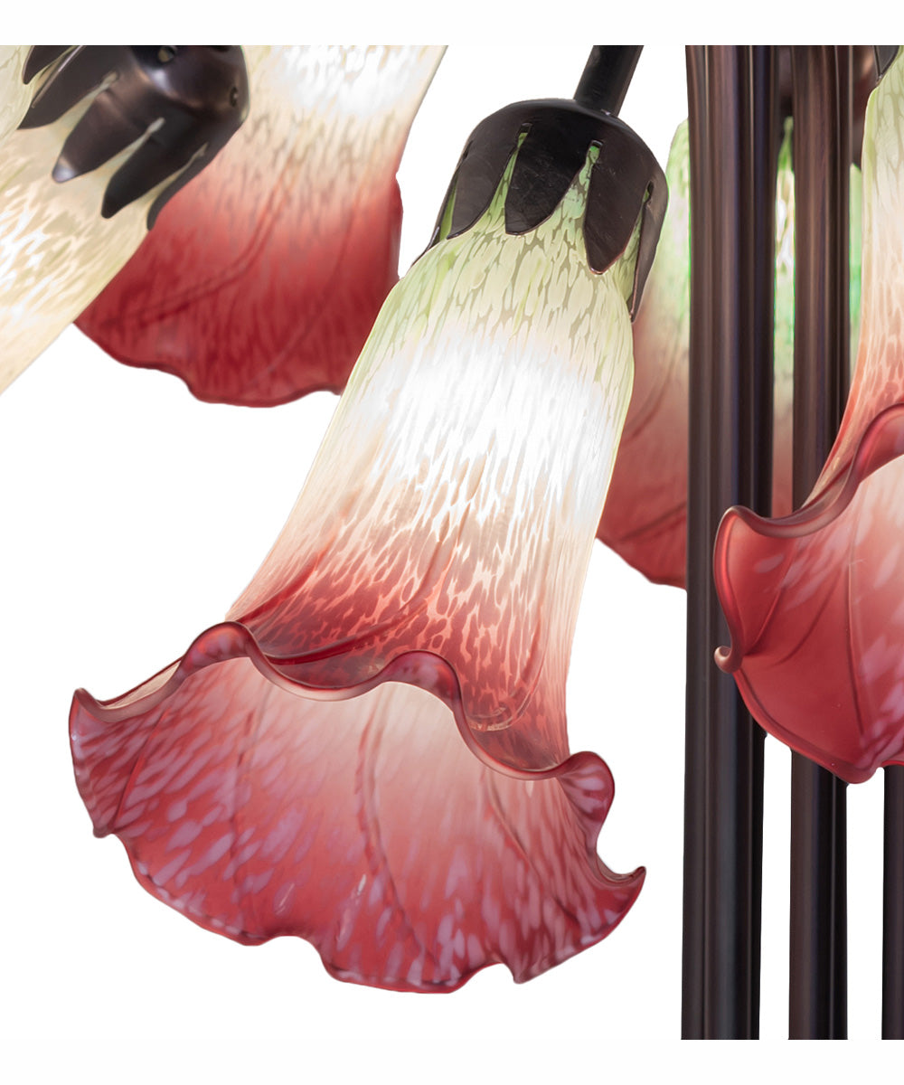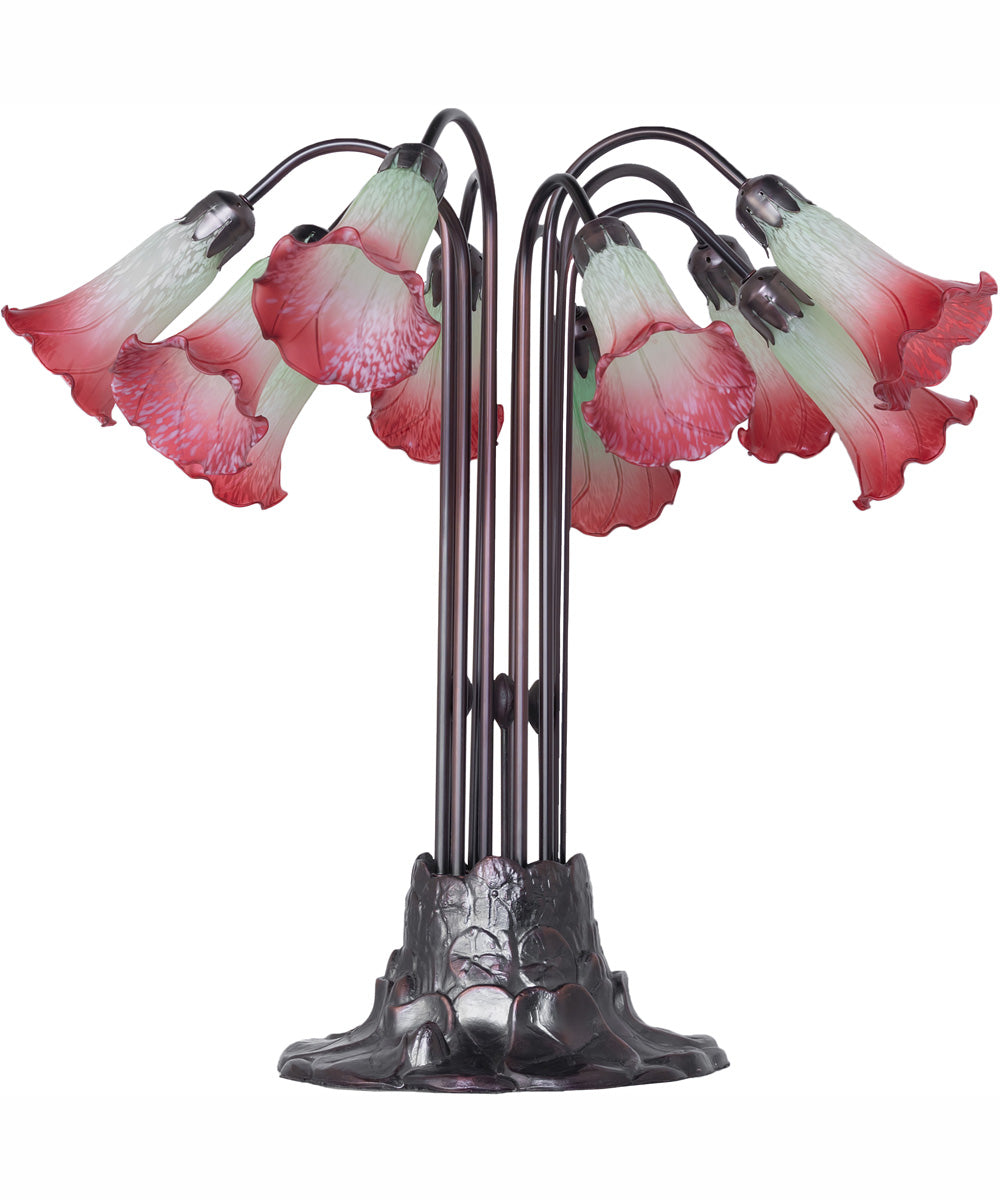 One of the most popular Louis Comfort Tiffany styled lamps on the market today; recreating his famous Favrile design from the early 1900's. This softly mottled Petal Pink shaded Ten Light Table Lamp offers an attractive; delicate design featuring shades mouth blown of fine art glass. Lily shades are suspended from stems delicately winding above a Lily pad base finished by hand in Mahogany Bronze.