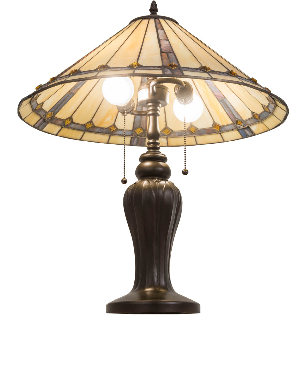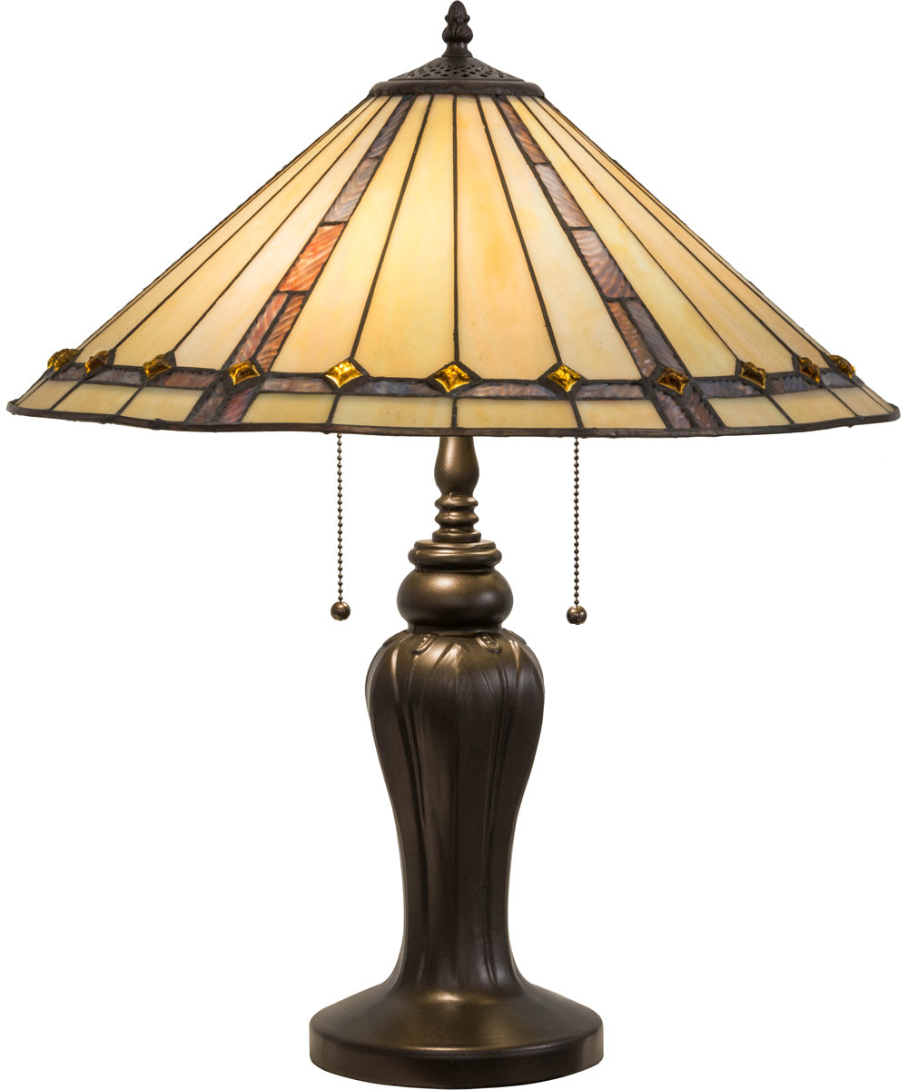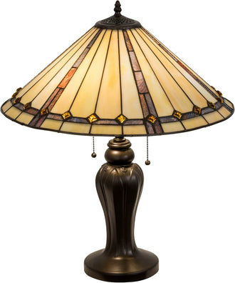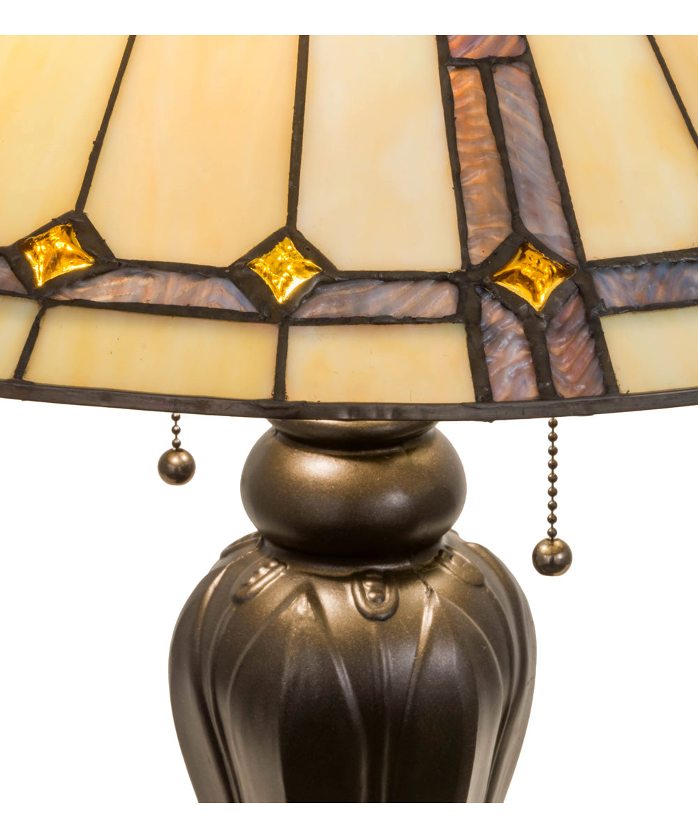 The 24"H Belvidere Table Lamp is a stunning piece that embodies timeless elegance and craftsmanship. This lamp features a beautifully crafted mahogany bronze finish base, which exudes a classic and sophisticated charm. The base is made from high-quality metal or polyresin, ensuring durability and longevity. The lamp's shade is meticulously handcrafted with chocolate and beige stained glass, creating a warm and inviting glow when illuminated.