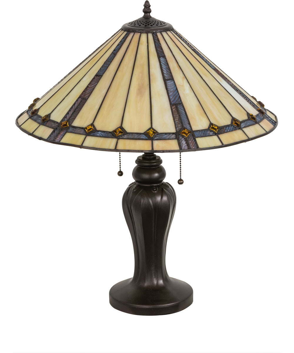 Recap: The 24"H Belvidere Table Lamp features a mahogany bronze finish, handcrafted stained glass shade, and accommodates two 60-watt bulbs. It's perfect for living rooms, bedrooms, and home offices, and complements traditional, vintage, and transitional decor styles. Order now to add a touch of timeless elegance to your home.