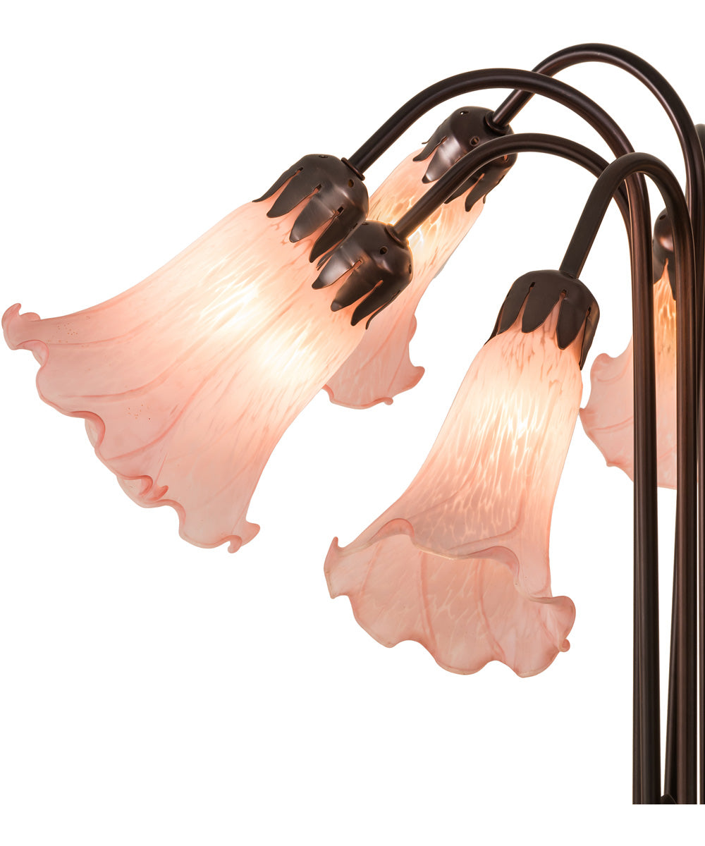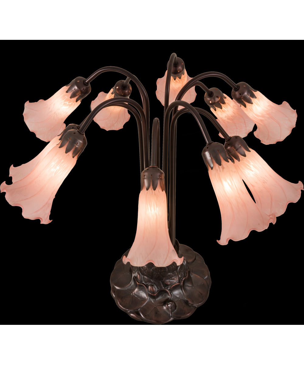 The 24"H Pink Pond Lily 10 Light Table Lamp is a stunning piece that brings the timeless elegance of Louis Comfort Tiffany's Favrile design from the early 1900s into your home. This lamp features ten delicately crafted lily shades, each mouth-blown from fine art glass in a softly mottled petal pink hue. The shades are gracefully suspended from elegantly winding stems, creating a harmonious blend of nature-inspired artistry and functional lighting.