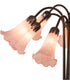 The lamp's exquisite pink glass shades emit a warm, inviting glow that adds a touch of romance to any space. The mahogany bronze finish on the metal base and stems complements the soft pink hues, creating a cohesive and luxurious look. The base itself is intricately designed to resemble lily pads, further enhancing the lamp's botanical theme and adding to its overall charm.