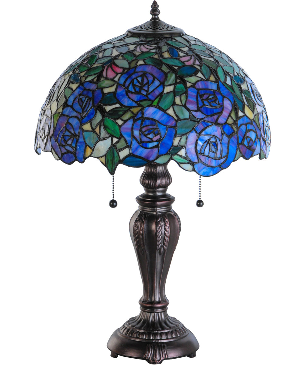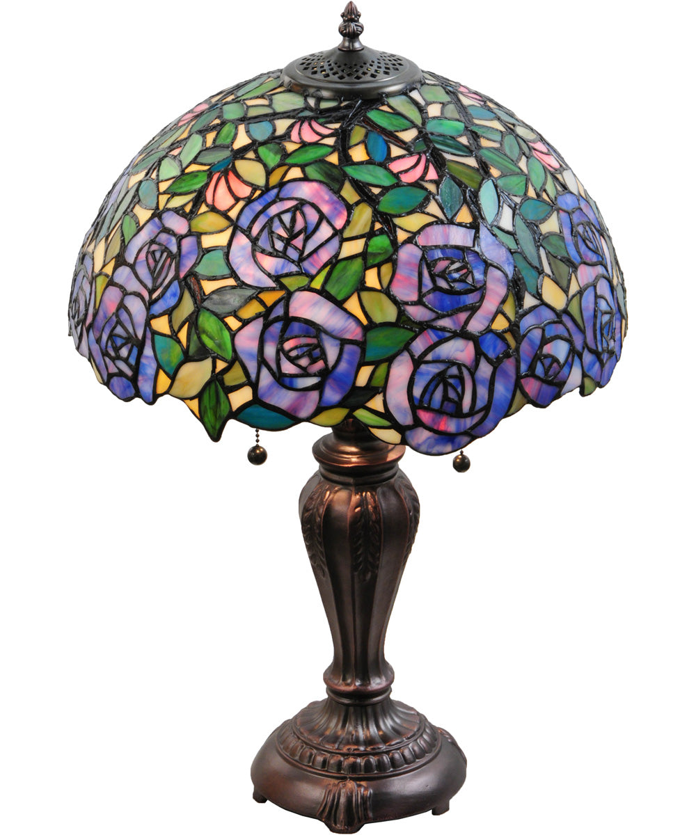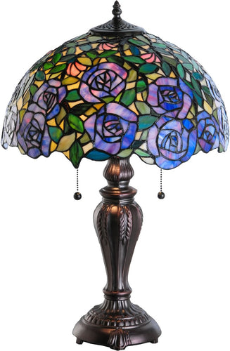 The 24"H Rosebush Table Lamp is a stunning embodiment of timeless elegance and intricate craftsmanship. This exquisite lamp features a delicate domed stained glass shade, meticulously crafted using Meyda's famous copperfoil construction technique. The shade showcases a mesmerizing array of Blue and Pink Passion art glass roses, intertwined with a maze of Garden and Leafy Green leaves, creating a vibrant and enchanting floral display. The hand-finished Mahogany Bronze table base adds a touch of sophistication, making this lamp a true work of art.