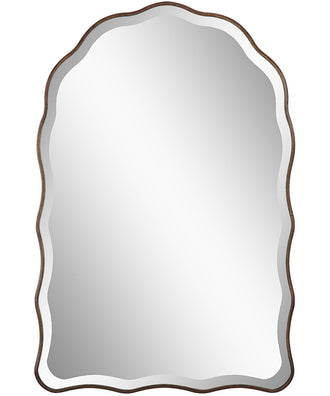 Scalloped edges define this beautiful arch top mirror, giving it a more feminine and delicate appearance. The frame is finished in an antique bronze with gold highlights and surrounds a 1" beveled mirror.