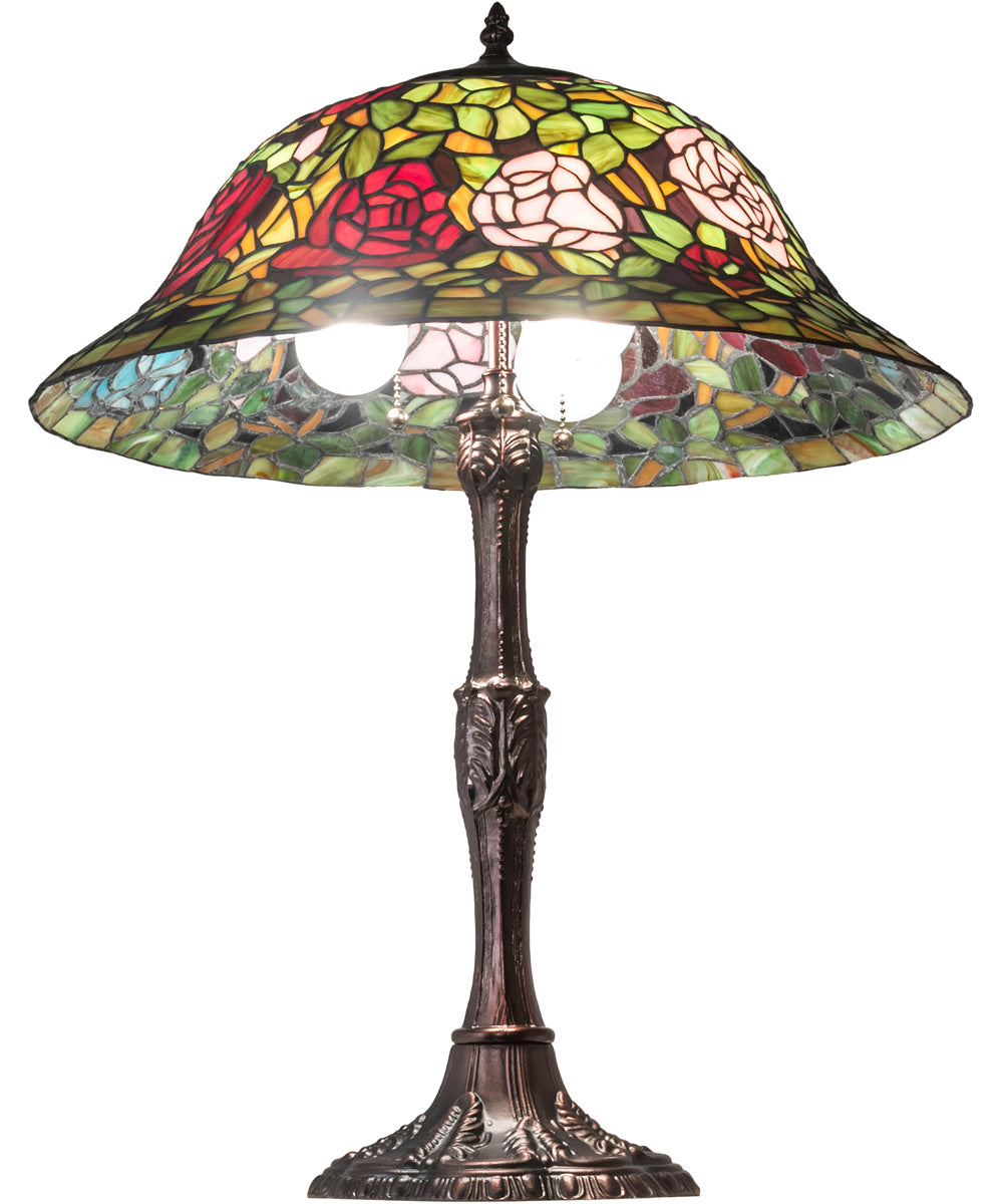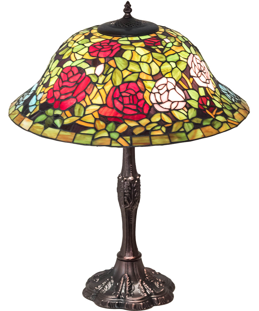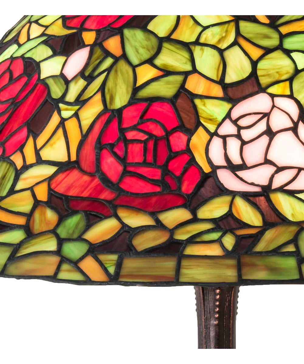 The most beloved of all floral beauties. The Rosebush is beautifully represented in this stunning reproduction of a Tiffany Studio Classic. Petal Pink; Romantic Red and Beautiful Blue art glass Roses ramble on a maze of Garden Green leaves. The shade is created using the famous Meyda Tiffany copperfoil construction. The delicate domed stained glass shade is paired with a Mahogany Bronze finished lamp base. UL and cUL listed for dry locations.
