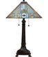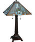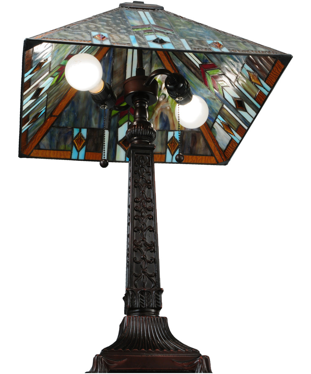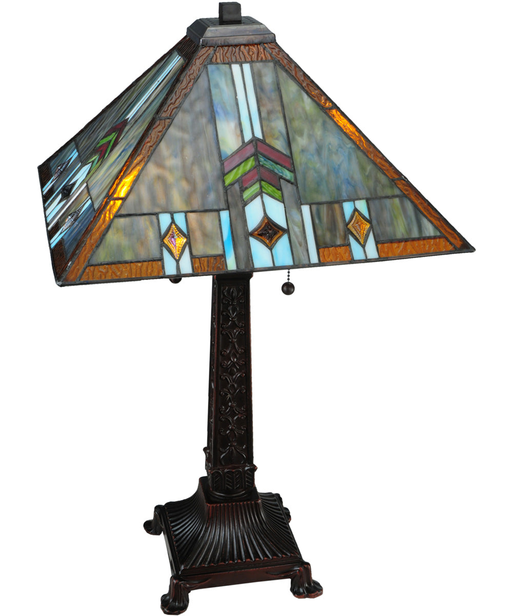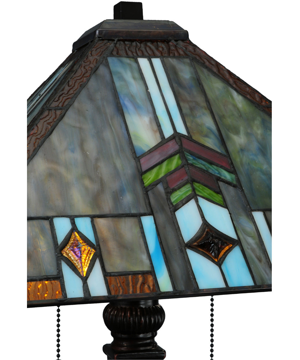 The 27"H Prairie Wheat Sunshower Table Lamp is a stunning piece that effortlessly merges classic Mission style with modern elegance. This lamp features a geometric pyramid-shaped shade crafted from authentic stained glass using Meyda Tiffany’s renowned copperfoil construction process. The intricate design showcases "Cats Paw" art glass in a harmonious blend of Gray, Blue, Green, and Purple hues, accentuated by Sky Blue highlights around Amber cast glass jewels. The Purple and Green glass chevrons add a touch of sophistication, while the Amber glass trim completes the look with a warm, inviting glow.