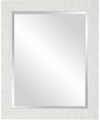A soft white finish enhances this rectangular frame's simple yet interesting pattern. A 1" bevel mirror completes the look. May be hung either vertically or horizontally.