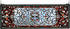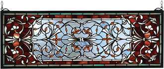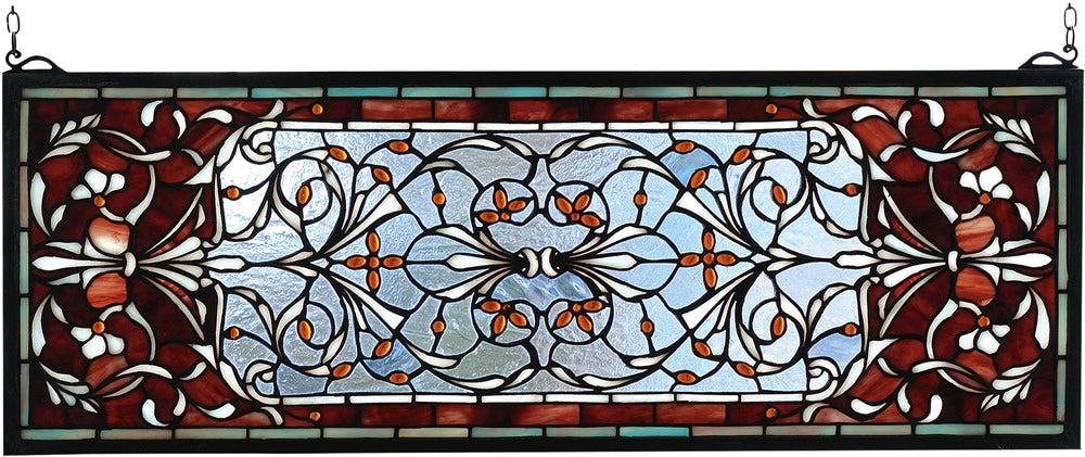 A Pomegranate Red border is centered over a Frosty Blue field with flowers and flourishes of Wispy White and Amber jewels. This Meyda Tiffany classic transom window is created of 512 hand cut pieces of stained art glass. The solid frame is made of the same brass as the hanging bracket and chains that are included with this window.