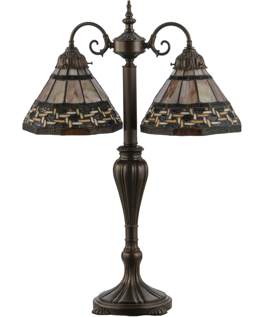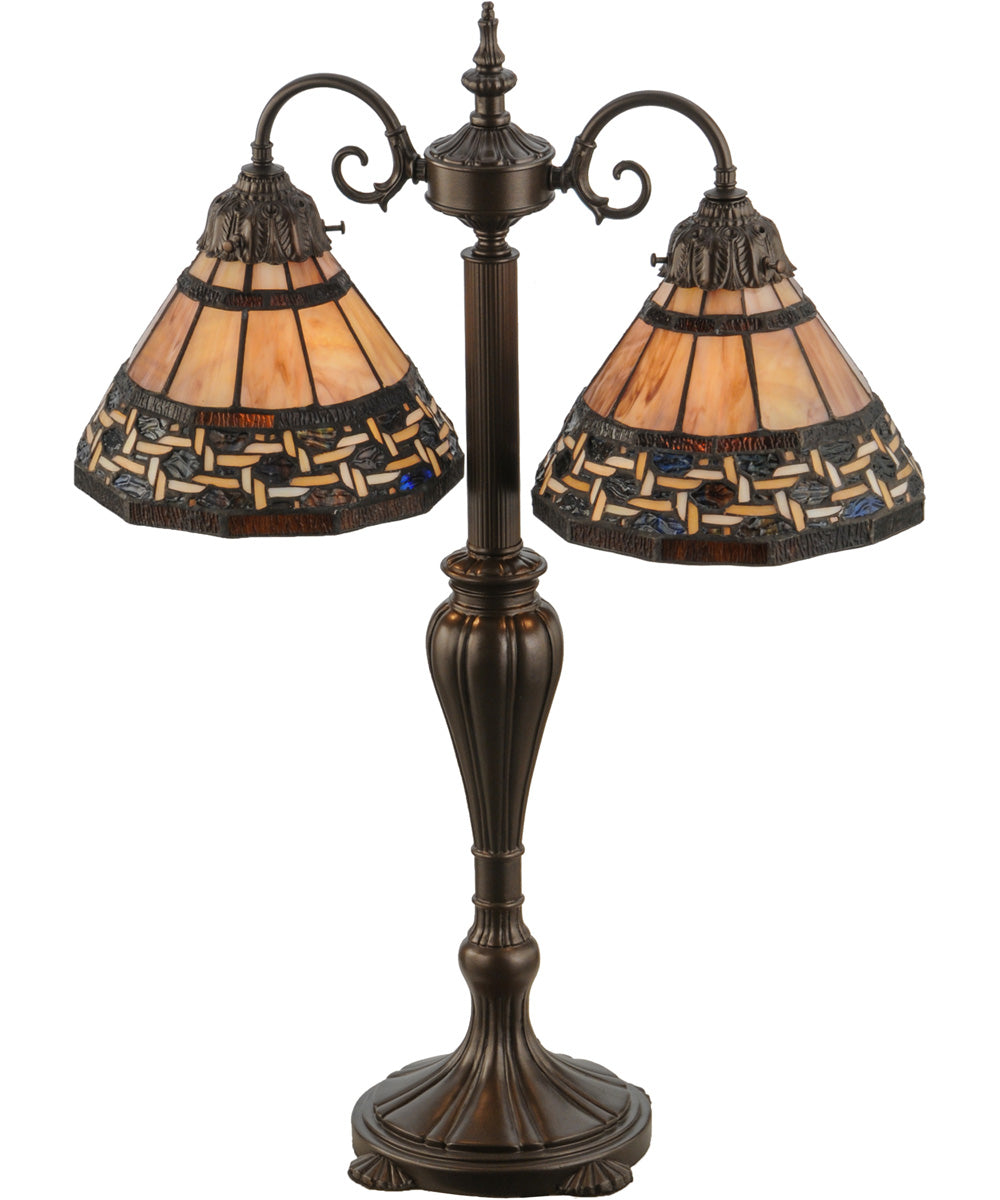 The 28"H Ilona 2 Light Table Lamp is a stunning example of exquisite craftsmanship and timeless design. Each Meyda Tiffany item is a unique handcrafted work of art, ensuring that no two lamps are exactly alike. This table lamp features a beautifully detailed metal or polyresin base with a rich Mahogany Bronze finish, providing a touch of elegance and sophistication to any room.