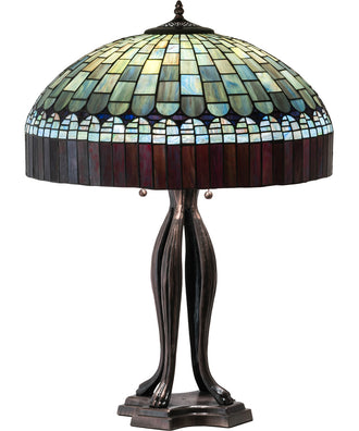 The 30" High Tiffany Candice Table Lamp is a stunning piece that brings together the beauty of early 20th-century artistry and modern craftsmanship. The lamp features a dome-shaped shade with intricate brickwork, reminiscent of woven fabric with a fringed skirt, crafted from multi-hued art glass. The shade's vibrant colors include Plum, Emerald, Cobalt, Heather, Xanadu, Azure, and Saffron, creating a mesmerizing display of light and color. The base, finished in a rich Mahogany Bronze, adds a touch of elegance and sophistication to any room.