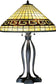 The 30"H Greek Key Table Lamp is a stunning piece that brings a touch of classic elegance to any room. Inspired by the geometric patterns of the Tiffany Studios, this lamp features a sophisticated Greek key motif executed in a granite-textured olive brown on a Parthenon beige grid. The intricate design is bordered with metal bead trim, adding a refined touch to its overall appearance. The lamp's base, finished in a rich mahogany bronze, complements the stained glass shade perfectly, creating a harmonious blend of colors and textures.