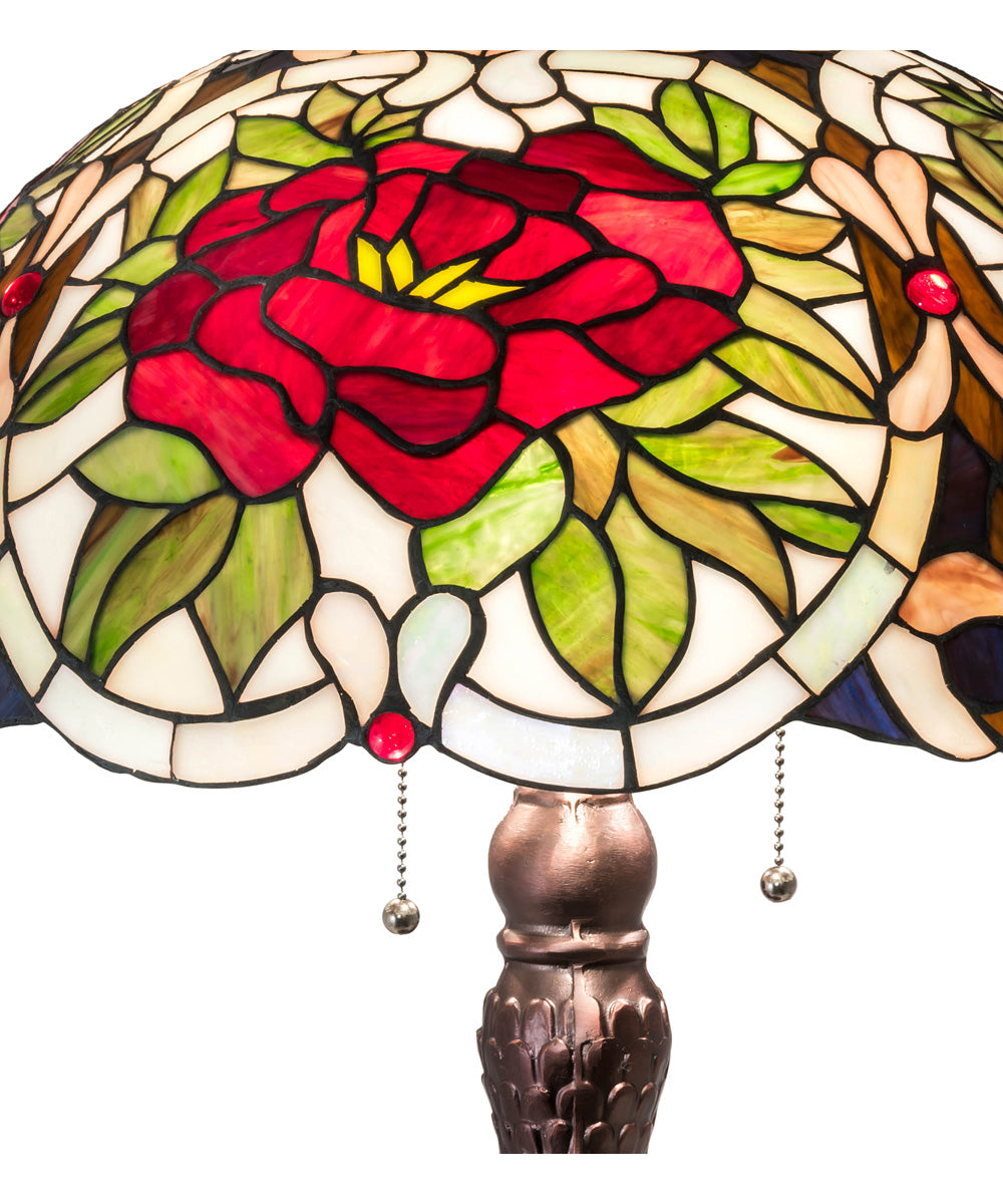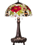The 31" High Renaissance Rose Table Lamp is a stunning piece that exudes elegance and timeless charm. Its art glass shade is adorned with vibrant Cabernet Red Roses, framed by Sunset Green leaves and delicate Ivory scrolls, all set against a mesmerizing Lavender and Plum Bronze lace background. This intricate design is further enhanced by the inclusion of Red jewels, adding a touch of sparkle to the already captivating aesthetic.