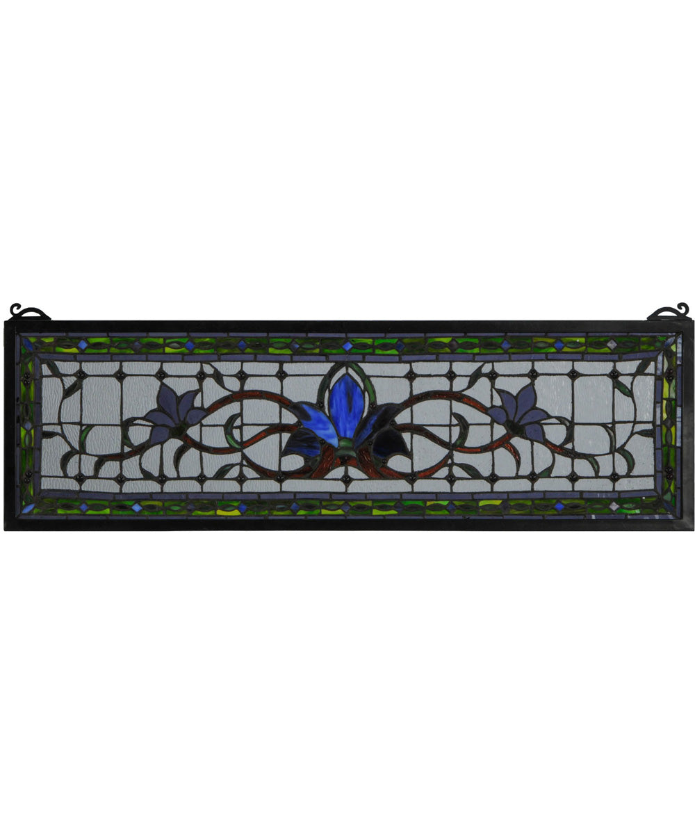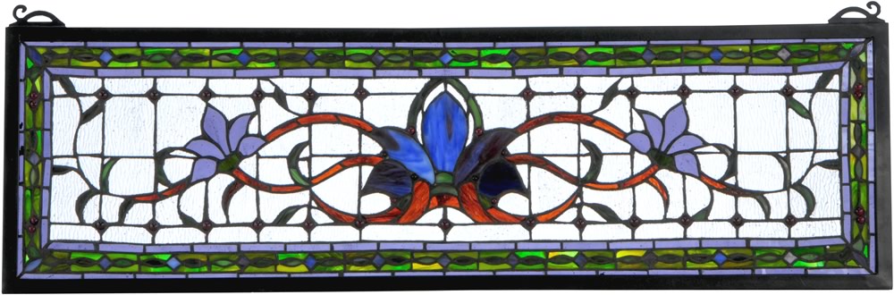 Herald in a touch of class to your home with this stylized floral stained glass window that features beautiful vivid colors in a simplistic design. At the focal point of this window is a cobalt flower flanked by violet flowers on each side. mahogany stems and green leaves wed the floral design on a clear back ground accented with plum jewels. A green chain link design accented with blue diamonds and plum jewels is surrounded by violet to complete the design. This stunning window is created using Meyda Tiffany?s famous copper foil construction process and attached to a Black frame. This transom window can be used above a door or placed as a pair on both sides of a door; especially in entryways. Brackets and hanging chains are included.