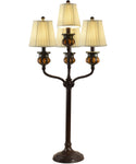 The 39 Inch H Amber Bedalo 4-Light Bronze Buffet Lamp is a stunning blend of chandelier elegance and buffet lamp functionality. Standing tall at 39 inches, this exquisite lamp boasts an Antique Bronze finish that exudes timeless sophistication. The metal base features a round pedestal that provides stability and a sleek center column that adds to its refined look. At the top of the center column, four gracefully curved arms extend outward, each adorned with a matching candle cup featuring oval amber art glass insets. These intricate details are beautifully complemented by gently flared and pleated shades made from natural fabric, which enhance the lamp's overall aesthetic.