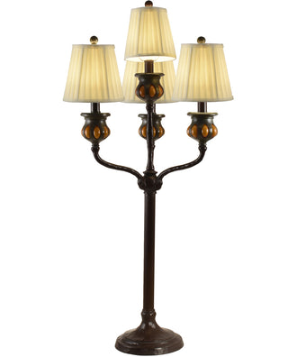 With its Antique Bronze finish and amber art glass accents, the Amber Bedalo 4-Light Buffet Lamp seamlessly fits into various room themes. It pairs beautifully with classic, vintage, and transitional interiors, adding a touch of old-world charm and elegance. The natural fabric shades provide a warm, inviting glow that enhances the cozy atmosphere of any space. Whether your décor features rich wood tones, plush fabrics, or ornate details, this lamp will complement and elevate your design scheme.
