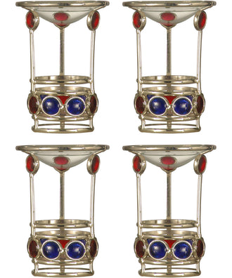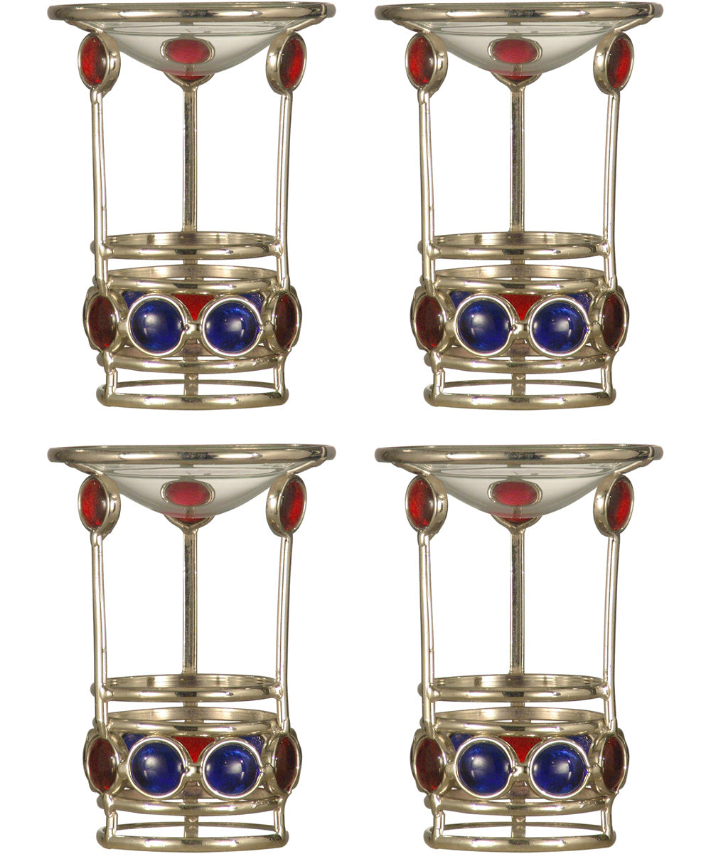 Always at the forefront of home design trends, we are pleased to present our Red and Blue Gem 4-Piece Candle Holder Set. The set includes 4 matching metal frame candle holders in a silvery finish. We added a row of large blue art glass gems around the base and red glass gems just under the glass martini style candle cup for colorful sparkle and shine. The holders are perfect for displaying ball candles (candles not included). Each holder is pretty when displayed on its own; try displaying in different combinations for a look that is yours alone. Our Red and Blue Gem 4-Piece Candle Holder Set also makes a wonderful gift for any occasion whose recipient will proudly display for many years to come.