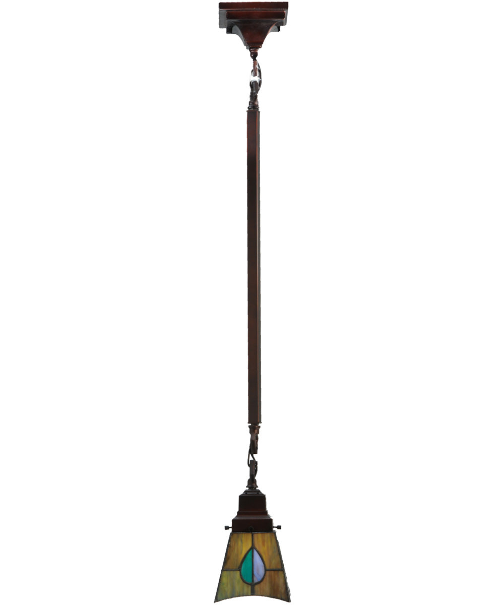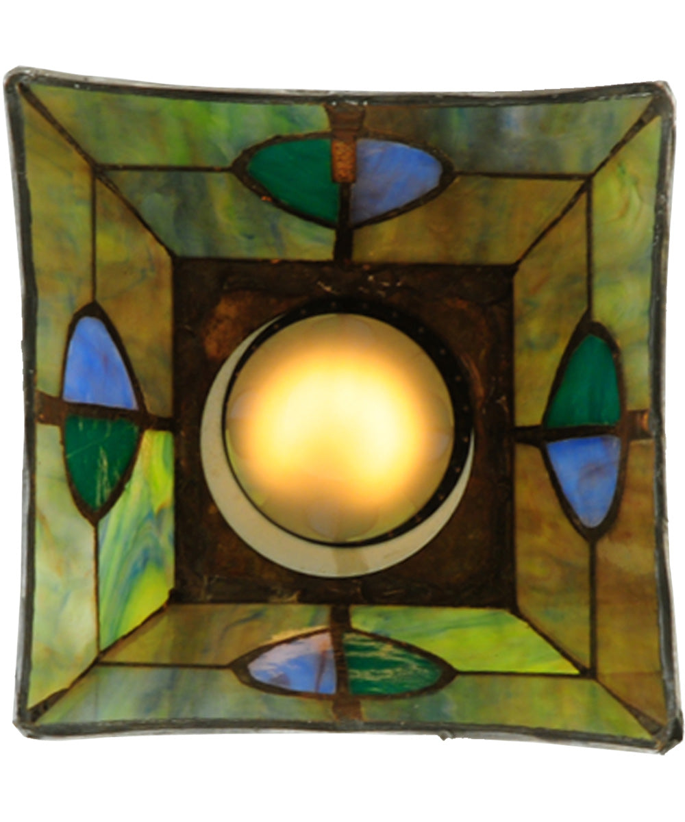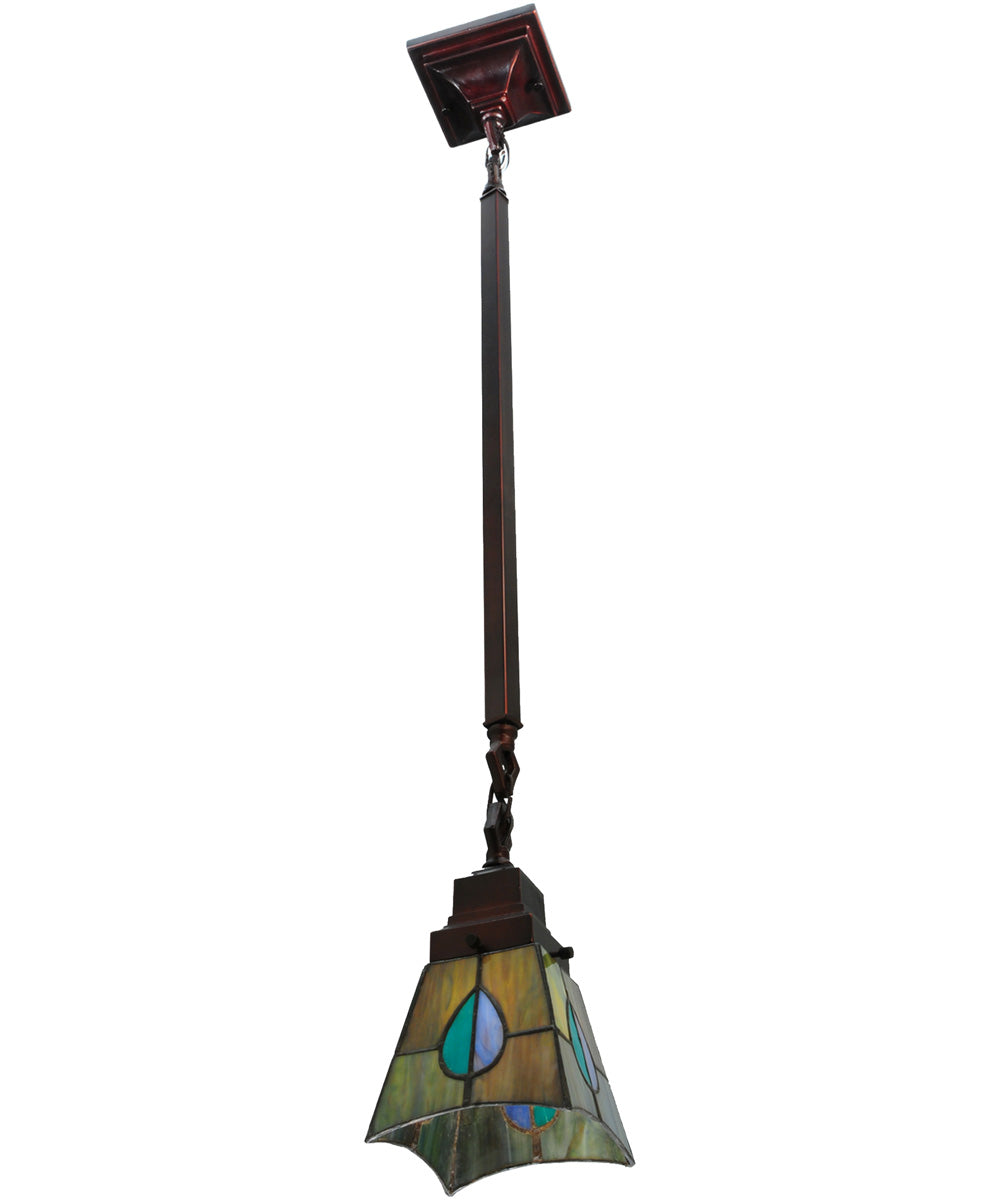The 5"W Mackintosh Leaf Mini Pendant is a stunning example of exquisite craftsmanship and timeless design. This mini pendant light features a beautiful blend of amber, green, blue, and violet glass, meticulously arranged to create a captivating visual effect. The unique leaf pattern adds a touch of nature-inspired elegance, making it a perfect addition to any room with a classic or contemporary decor. The metal or polyresin base material provides a sturdy foundation, ensuring durability and longevity.