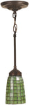 This exquisite mini pendant features an antique finish that complements its timeless design. The pendant's shade is crafted from green glass arranged in a mosaic pattern, creating a captivating visual effect. The metal or polyresin base material adds durability and a classic touch to the overall design. The combination of these elements results in a sophisticated and stylish lighting fixture that can elevate the decor of any room.